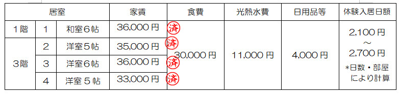 ※光熱水費・日用品等は4ヶ月ごとに精算いたします。